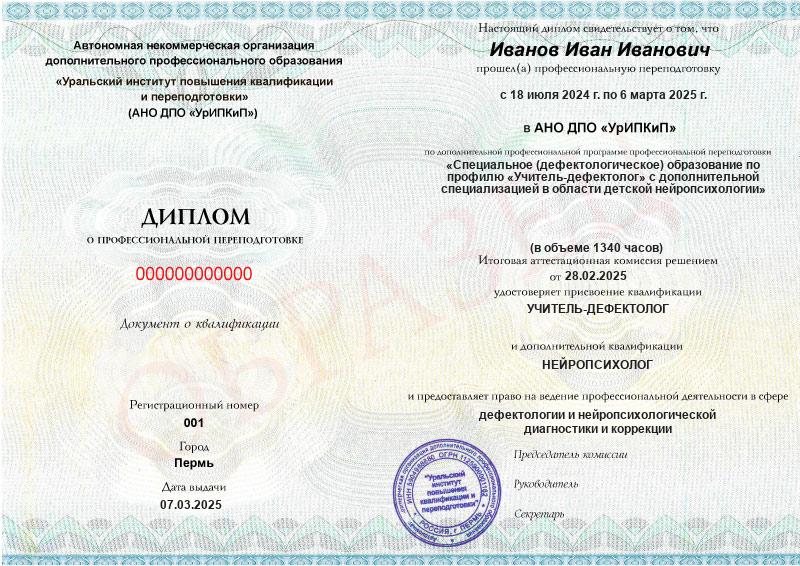 Курс обучения Специальное (дефектологическое) образование по профилю «Учитель-дефектолог» с дополнительной специализацией в области детской нейропсихологии (1340ч)