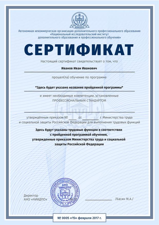 Сертификат компетенцийДополнительно, вы можете получить сертификат компетенций с перечнем освоенных трудовых функций, соответствующих профессиональному стандарту. Сертификат может учитываться в процессе аттестации.